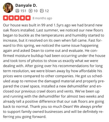 Our closed crawl dehumidifier(dehu) system includes removing all old or damaged moisture barrier, seal all openings within the crawlspace, install vent covers, and new moisture barrier taped at the seams for 100% coverage. Install the dehu with external pump and drain line then have a licensed electrician install a GFI outlet in crawlspace